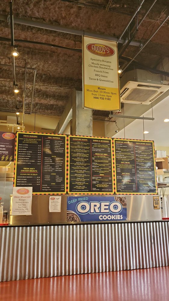 Welcome to Buddy’s Burgers - Kennett Square, a delightful destination for burger enthusiasts located at 148 W State St, Kennett Square, PA. This vibrant eatery specializes in mouthwatering burgers, featuring signature options like the Classic Buddy Buddy and the bold Cajun Buddy Buddy, each made fresh and bursting with flavor. For those seeking lighter fare, the menu also boasts a selection of crisp salads such as the Mexican Chicken Salad and the hearty Carolina Cobb.